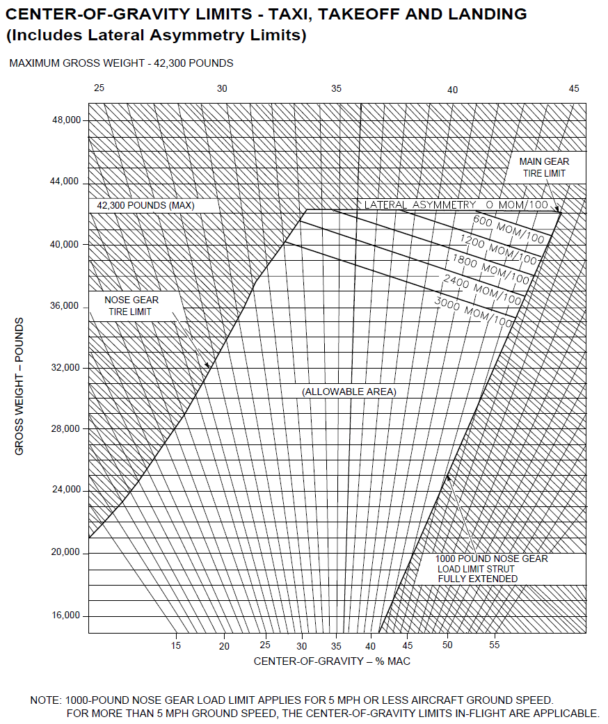 Here is a figure showing the allowed limits of CG displacement in %MAC. You can see here that the FLCS is quite resistant to CG displacement. Pay attention to the asymmetry problem as well for heavy weights.