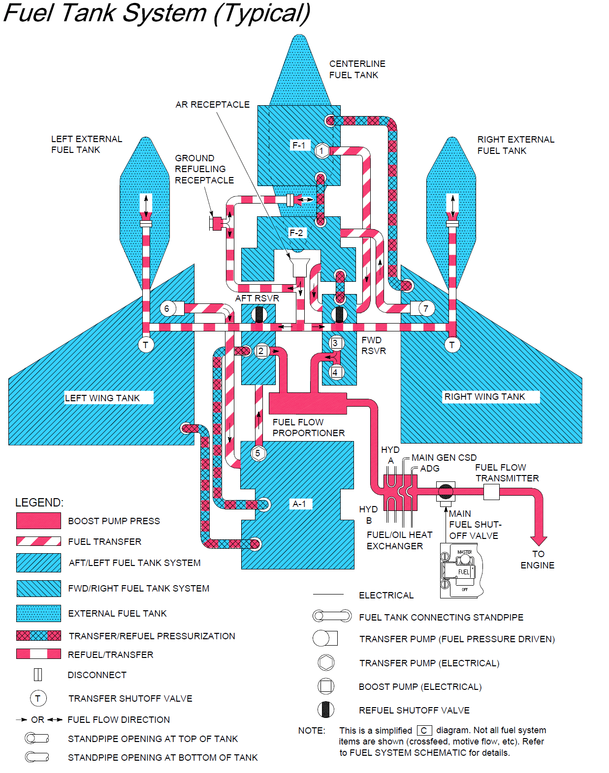 Note that the fuel selector FWD/AFT is now really acting on the balance of the aircraft and plays on the position of the CG along the Y axis. It could theoretically be used to “trim” the AC in roll. You might be wondering “I thought we were talking about forward and aft, how can that affect roll?” Recall that the fuel tank system is a two-part system consisting of Forward-Right and Aft-Left tank components. The forward reservoir is on the right side of the fuselage body, while the aft reservoir is on the left side of the fuselage body, thus affecting roll left/right. Here is a schematic of the fuel tank system, note the F-2 tank that is now included in BMS.